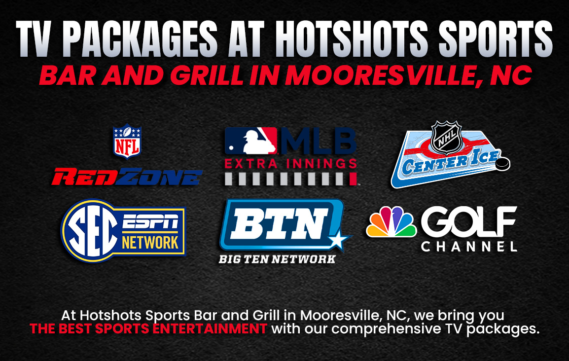 At Hotshots Sports Bar and Grill in Mooresville, NC, we offer many amenities to enhance your experience. With 30 large HDTVs, a spacious patio, pool tables, Golden Tee, bags boards, steel tip dart boards, Mega Touch games, and a non-smoking environment, there’s always something to enjoy. Plus, stay connected with our free Wi-Fi while you relax and have fun. See why Hotshots is the perfect place to meet friends, enjoy great food, and catch all your favorite sports!